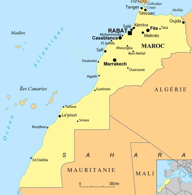 Les pays frontaliers sont l'Algérie et la Mauritanie. Il est également non loin des côtes espagnole séparés par le détroit de Gibraltar.